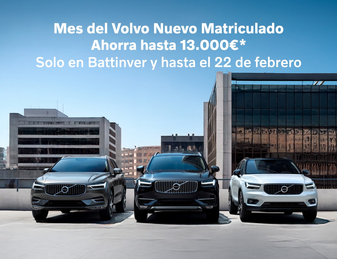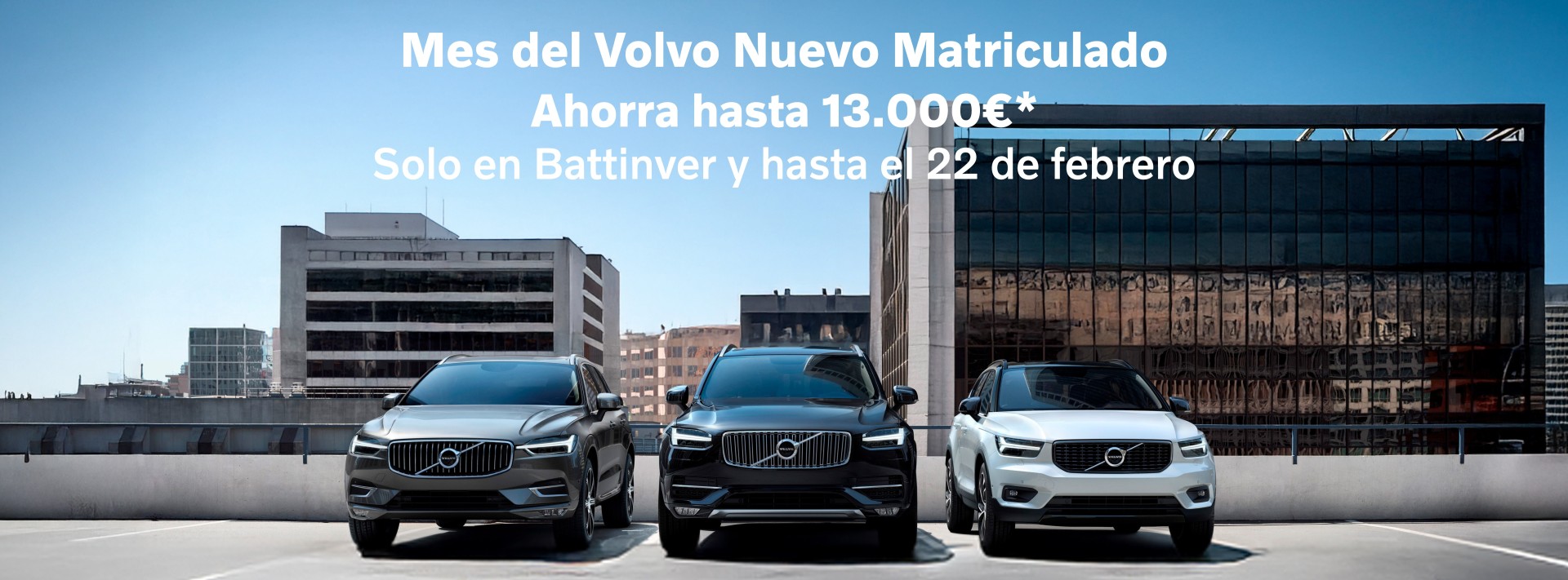 (*) Los precios al contado de las unidades mostradas son válidos para Península y Baleares e incluye IVA, transporte, aportación del fabricante y la Red de Concesionarios e impuesto de matriculación. Dichos precios corresponden a unidades de vehículos nuevos matriculados a estrenar y según la unidad puede conseguir un ahorro hasta 13.000€ sobre el precio de venta habitual. Oferta disponible en concesionarios Volvo Battinver desde el 22/01 hasta el 22/2/2026 o hasta agotar existencias. Las imágenes pueden no corresponder a los vehículos ofertados. Consulta las condiciones de la oferta en el concesionario. Oferta no compatible con otras vigentes.